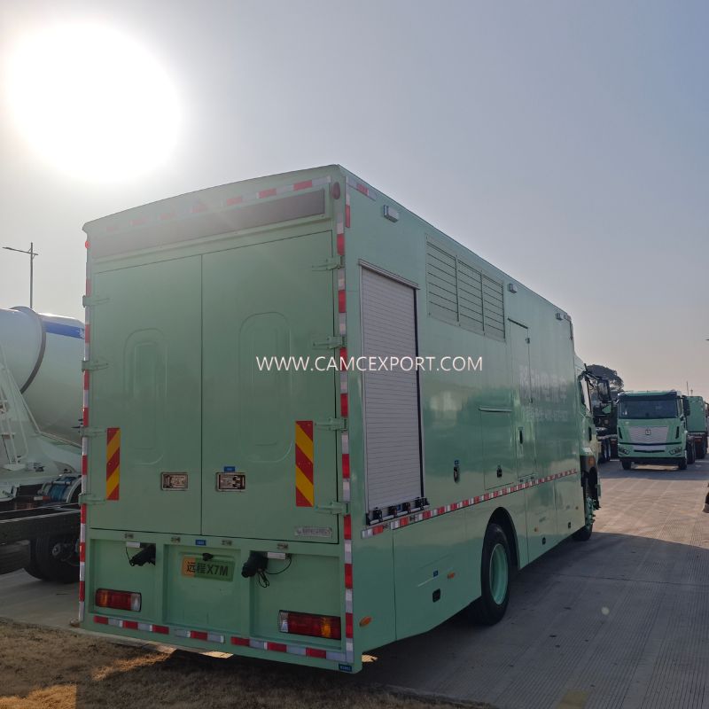 إنها تعتمد تكوين القيادة اليسرى 4×2، مع محرك الميثانول كقوة أساسية وطاقة خرج مستمرة تبلغ 320KW؛ وهي مجهزة بخزان وقود الميثانول ذو السعة الكبيرة، والذي يمكن أن يعمل بشكل مستمر لأكثر من 12 ساعة تحت مصدر طاقة كامل الحمل؛ تصميم السقف المسطح يجعل الارتفاع الإجمالي للمركبة يتكيف مع مختلف الأقسام المقيدة الارتفاع، مع درجة حماية IP54، والتي يمكن أن تلبي احتياجات التشغيل الخارجية للحماية من المطر والغبار؛ يتوافق الوزن الفارغ مع المعايير ذات الصلة لمركبات العمليات الخاصة الثقيلة، مما يضمن الامتثال في كل من القيادة والتشغيل.
